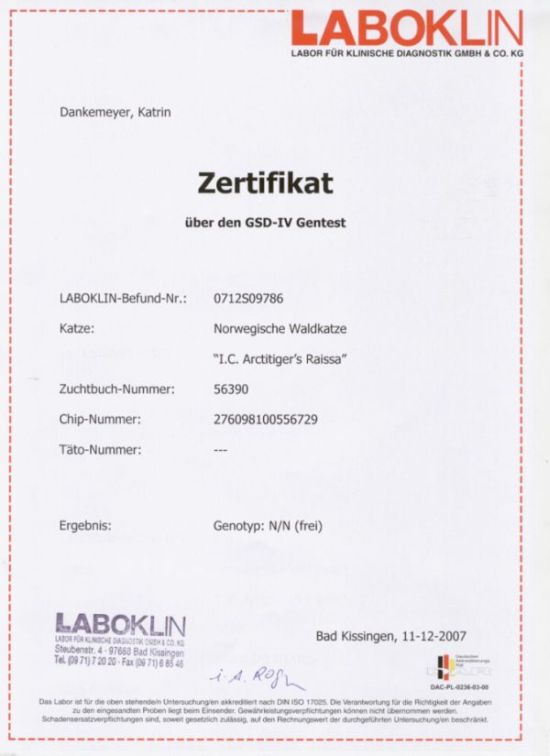 Gentest vom 11.12.2007 bei Laboklin Ergebnis: