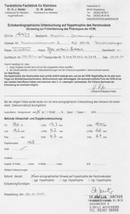Ultraschalluntersuchung vom 05.11.2007 von Dr. Martin Janthur Tierärztliche Klinik für Kleintiere in Wasserburg (bei Lindau) Ergebnis: