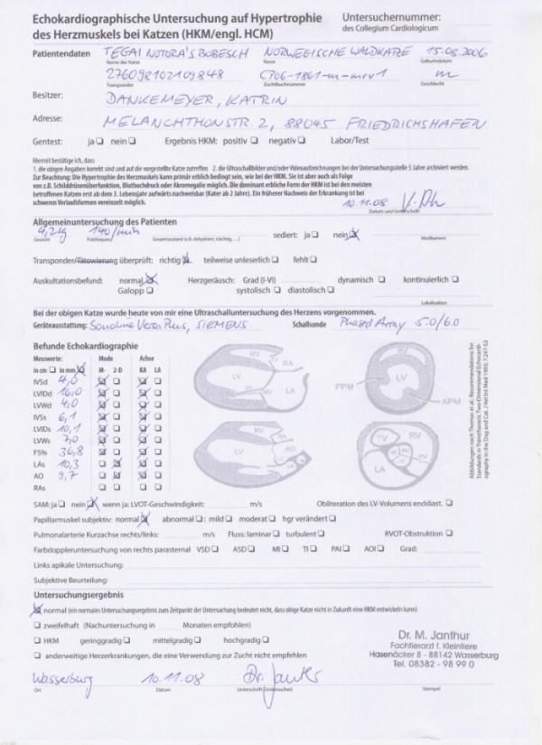Wiederholte Ultraschalluntersuchung vom 10.11.2007 von Dr. Martin Janthur Tierärztliche Klinik für Kleintiere in Wasserburg (bei Lindau) Ergebnis:
